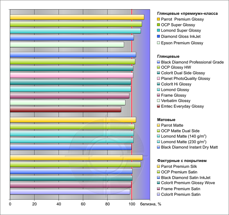 Рейтинг белизны фотобумаг (в порядке ее уменьшения) выстроился следующим образом.