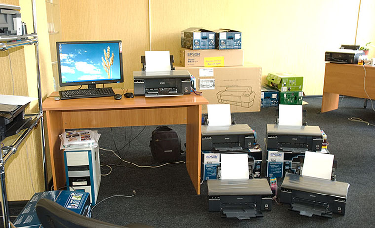 Во избежание ошибок при проведении тестирования, все процедуры печати проводились одним человеком. Печать велась одновременно на паре устройств, подключенных к портам USB одного компьютера (ОС Windows XP SP3, русская версия). Печать осуществлялась из программы Adobe Photoshop CS4 с использованием драйвера Epson версии 6.61 (язык – русский).