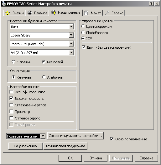 Стандартная настройка драйвера принтера, рекомендуемая для качественной фотопечати без использования цветового профиля. Предполагается, что пользователь сделал осознанный выбор, отключив встроенные опции обработки изображений: «устранение эффекта красных глаз» (интеллектуальная обработка), «сглаживание углов» (искусственное повышение детализации для изображений с низким разрешением)