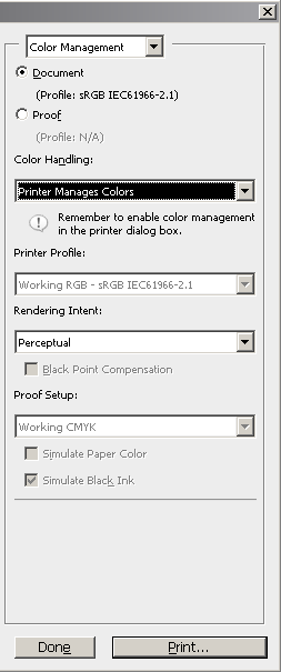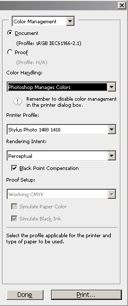 Настройка диалога печати Photoshop для печати с использованием цветового профиля. Управление цветом в драйвере принтера отключено. Цветом управляет приложение