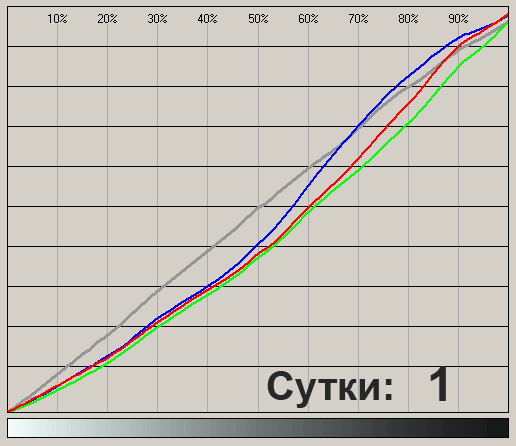 Динамика изменения значений для базовых цветов (цветные линии) и возможности профиля по удержанию баланса в сером (серая линия) |